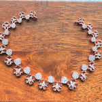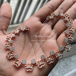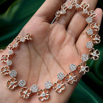 Beautiful blend of rose-gold shine and dazzling floral charms. Each flower is crafted with shimmering stones that catch the light effortlessly, giving you that premium, classy look without the heavy price tag!