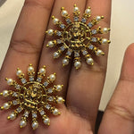 Lakshmi Pearl Stud earrings bring timeless elegance to traditional saree styling. These expertly crafted studs feature lustrous pearls that complement the rich textures and intricate patterns of saree draping.