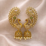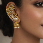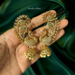 The beautifully carved peacock motif flows into a stunning jhumka adorned with pearls, giving the piece a luxurious traditional finish. Perfect for weddings, festivities, and special occasions, these earrings add an effortless royal touch to any ethnic outfit.