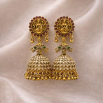 Elegant jhumka earrings featuring intricate Peacock and Lakshmi designs, embellished with sparkling AD stones for a rich traditional finish.