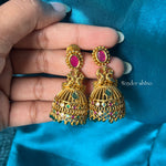 Perfect gold replica earrings featuring a sparkling ruby stone at the top and delicate emerald hanging beads. Beautiful and timeless.