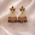 The graceful ruby emerald hanging stones create a subtle sparkle, making them suitable for any saree or festive outfit.