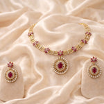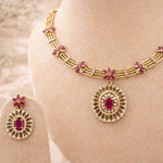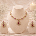 The vibrant ruby stone, paired with AD embellishments, creates a striking focal point that elevates any ensemble. Perfect for special occasions or as a statement piece for those who appreciate fine jewelry, this necklace delivers luxury with understated elegance. An investment in enduring style.