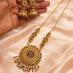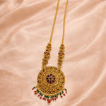 Make a statement of timeless elegance with our Royal Mandala Heritage Haram — a masterpiece designed for women who love grand, traditional charm. Featuring a striking circular pendant adorned with intricate floral detailing and ruby-green stone accents, this long necklace beautifully blends temple artistry with regal sophistication.