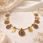 Elevate your festive look with this stunning Lakshmi Coin Traditional Mala, highlighted with vibrant green and pink stones. Rich in heritage charm and crafted for statement style, it adds instant elegance to any ethnic outfit. Perfect for weddings, celebrations, and gifting!
