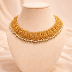 The rich antique gold finish is beautifully enhanced with emerald-green accents and a graceful fringe of luminous pearls, creating a perfect balance of grandeur and softness. Designed to sit regally on the neckline, this statement choker is ideal for bridal wear, festive occasions, and heirloom collections.