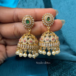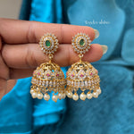 Made entirely of AD stones, this earring features a beautiful emerald-stone flower at the top, finished with a delicate pearl drop.