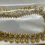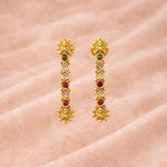 This necklace features radiant multi-color stones that catch light beautifully, paired with gracefully suspended Lakshmi coins that symbolize prosperity and abundance. Each element is thoughtfully arranged to create a harmonious balance of color and movement.