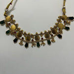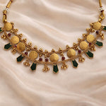 A striking kaasu choker featuring antique coin detailing, deep green accents, and delicate gold bead drops 💚