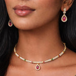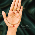 This necklace set is adorned with vibrant ruby red stones , accented by subtle green touches and shimmering AD Stones.